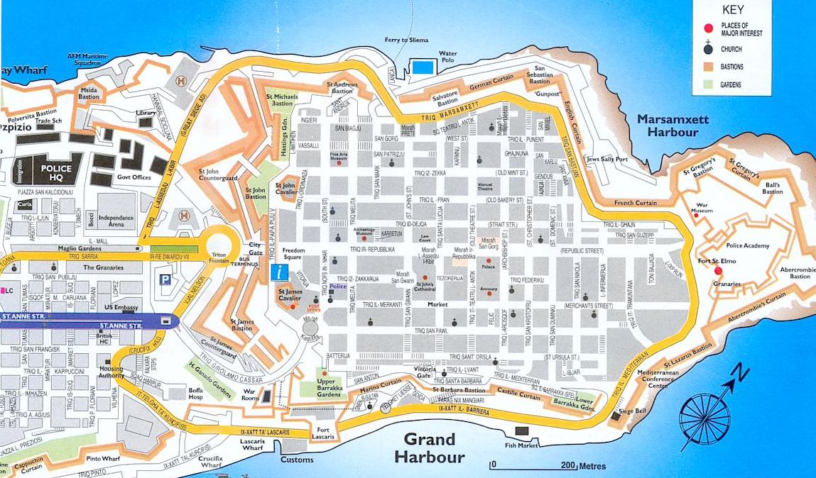 Główną ulicą miasta jest Triq ir-Repubblika, pełna sklepów i restauracji, na której zamknięty jest ruch kołowy. Ulica rozciąga się od Bramy Miasta (City Gate, obecnie remontowanej) do fortu św. Elma (Fort St Elmo), obok którego znajduje się Muzeum II wojny światowej (wejście dla osoby dorosłej – 6 euro).