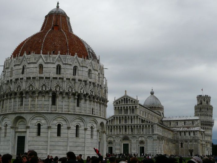 Uf, w końcu dotarłam! Po godzinnym spacerze moim oczom ukazała się krzywa wieża oraz Campo dei Miracoli, czyli Pole Cudów, na którym poza wieżą znajduję się katedra, baptysterium oraz cmentarz. Katedra, budowana na planie krzyża łacińskiego, powstała w latach 1063-1118, po pożarze w 1595 roku ponownie odbudowana w 1604 roku. Imponujące wrażenie robi fasada, która została podzielona na pięć kondygnacji galerii arkadowych z 54 marmurowymi kolumnami.